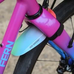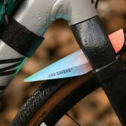 De speciaal ontworpen riemen bieden voldoende wrijving om te voorkomen dat het spatbord langs een taps toelopende vorkpoot glijdt. Het moet echter stevig worden vastgezet om omhoog te blijven. Door het open ontwerp van de band kunt u de lengte aanpassen en zo de positie van het ASS SAVERS-logo op de vorkpoot centreren. Je kunt het bandje ook omdraaien als je liever geen logo ziet.