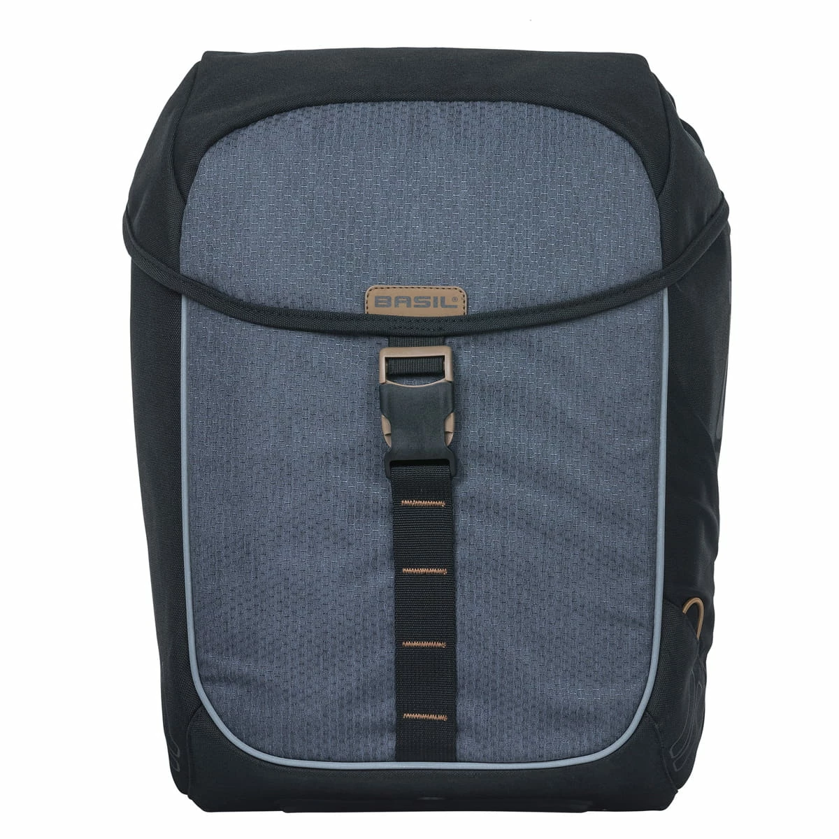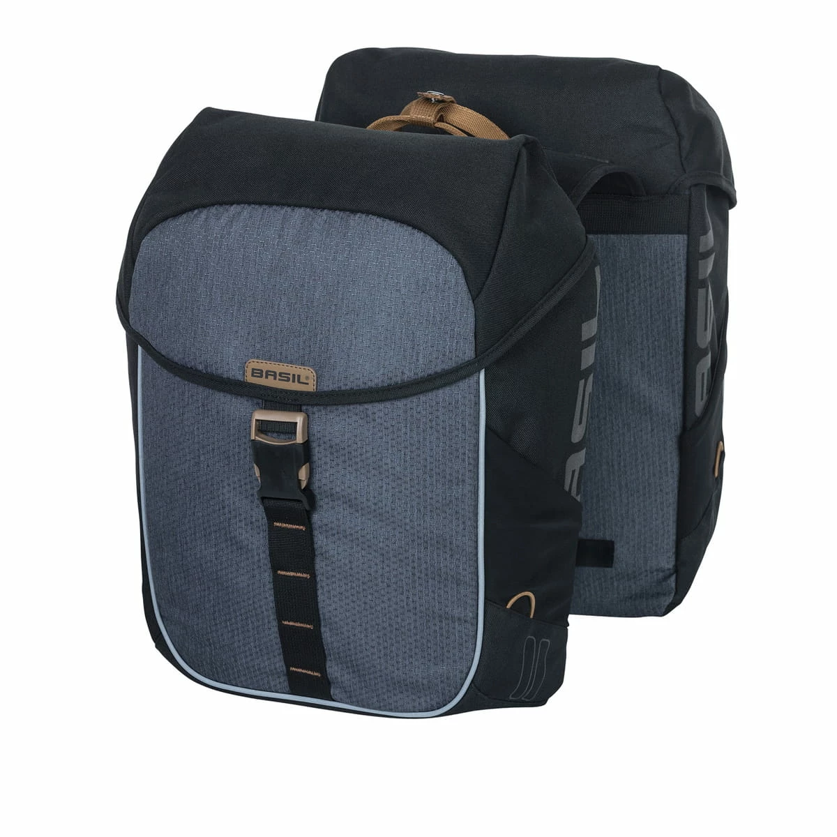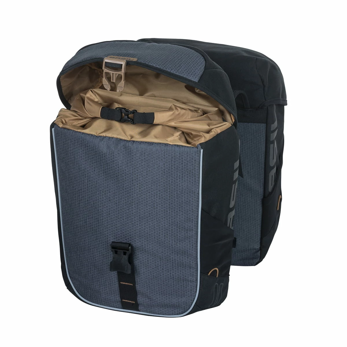 De Basil Miles Double Bag is een waterdichte dubbele tas met een grote inhoud van 34 liter. Boodschappen doen of fietsen door de Ardennen, deze tas maakt fietsen makkelijker en leuker. De donkergrijs / antraciet en bruine details geven deze tas zijn kenmerkende stijl. Als het regent, zorgt het waterdichte materiaal ervoor dat de inhoud van de tas droog blijft. Het universele brugsysteem van de tas past op de bagagedrager van Basil (ook op e-bikes) en kan worden gecombineerd met één of twee handgrepen met de i-Rack van Racktime. De reflecterende details helpen om beter zichtbaar te zijn in het donker. Er is ook gedacht aan een montagemogelijkheid voor LED-verlichting. De dubbele tas sluit met behulp van een rolsluiting en een drukknoop, en heeft een stevige binnenvoering. Doordacht ontwerp in een modieus design en het is ideaal voor winkelen, fietsen, vrije tijd, of de weg naar het werk.