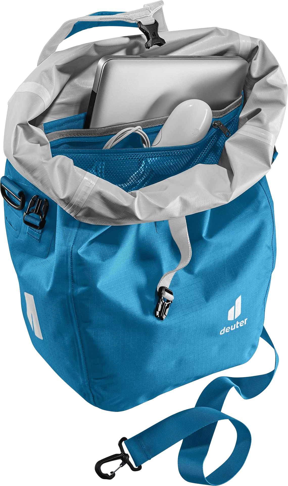 Of pure opbergtas met organizer unit op het achterwiel, grotere schoudertas om om je nek te hangen of praktische draagtas. Dankzij de afneembare schouderriem en verstelbare draaggreepsluiting met universele houder voor slaapmat of jas zijn er nauwelijks grenzen aan het gebruik van deze tas.