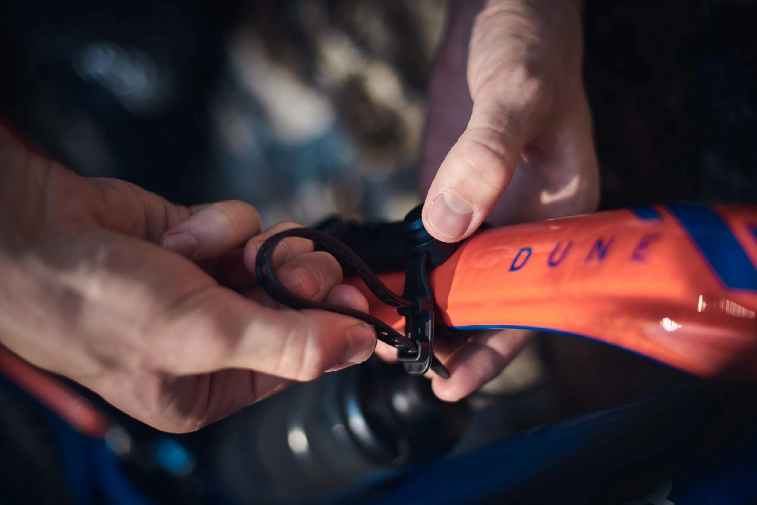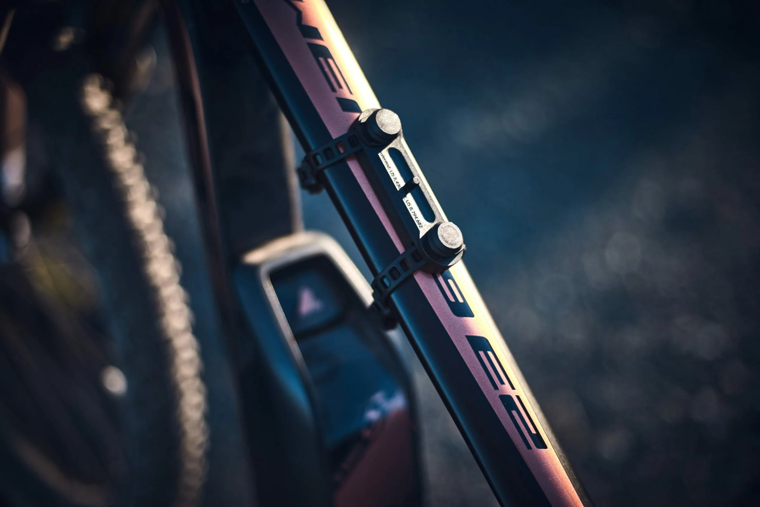 Als de schroefdraadbussen op het fietsframe al bezet zijn of niet beschikbaar zijn, kunnen de TWIST-modules veilig en slipvrij op de fiets worden bevestigd met de universele bidonhouder, de TWIST uni base. Gewoon plaatsen en vastmaken met de kabelbinders. Bovenbuis, onderbuis of zitbuis – de TWIST uni base past op elk frame.