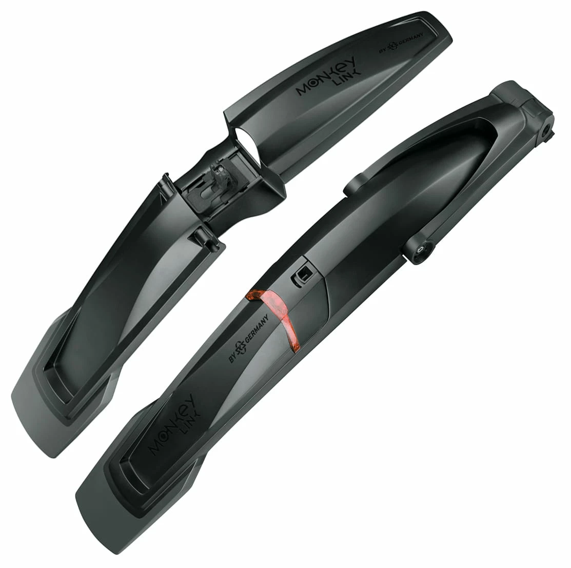 Met het innovatieve Monkey Link-systeem kunnen 2-componenten wielbeschermers eenvoudig en veilig worden bevestigd. Magnetische beugels maken montage kinderspel. Bijzonder praktisch: de geïntegreerde verlichting in de achterste wielkast neemt de functie van het achterlicht over. De SKS GERMANY wielbeschermer is geschikt voor zowel standaard mountainbike banden als mountainbike plus banden en kan gebruikt worden voor elke frame geometrie dankzij de variabele instelmogelijkheid.