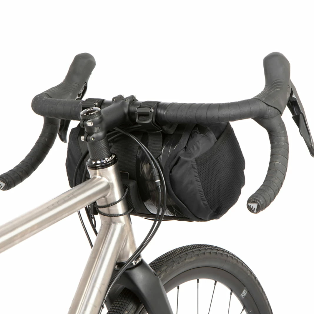 Schuimspacers en verende nokkensluitingen zorgen voor een gemakkelijke en betrouwbare bevestiging aan het stuur, terwijl een reflecterend elastisch trekkoord zorgt voor stabiliteit rond de balhoofdbuis. Een 100% waterdichte Dry Pack van 7 liter is speciaal ontworpen voor de Race Bar Bag. Hij heeft een rolsluiting, reflecterende details en zijzakken van stretchgaas om voedsel, handschoenen en andere benodigdheden voor onderweg in op te bergen.
