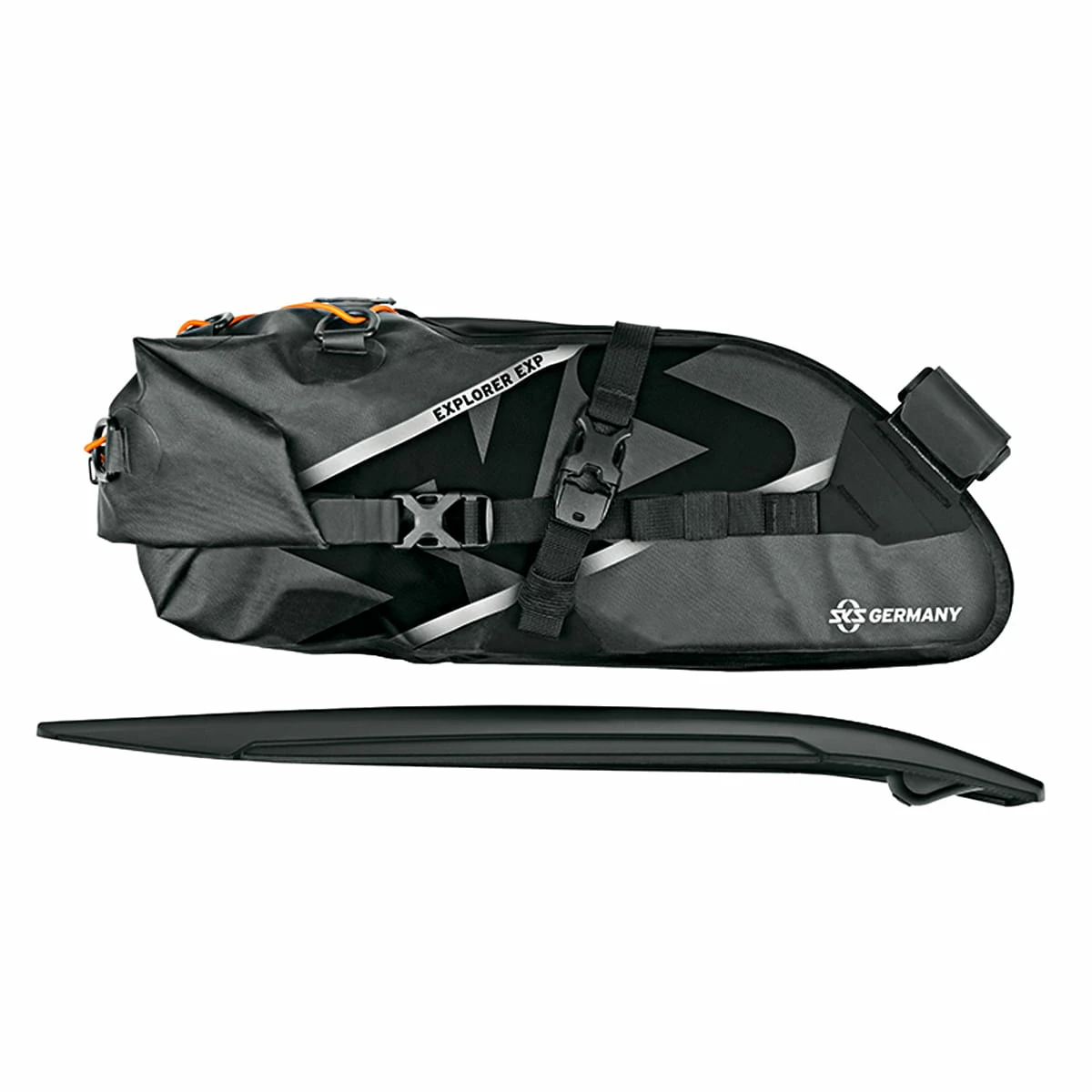 Zadeltas en spatscherm in één, dat is de Explorer EXP. De zadeltas biedt niet alleen veel opbergruimte, maar is ook uitgerust met een bevestigbaar spatbord. Het beproefde SKS X-Guard spatbord kan zonder gereedschap aan de onderkant worden vast- of losgeschroefd. De zadeltas wordt aan de zadelpen bevestigd met een rubberen band die het materiaal beschermt. Twee riemen maken ook een veilige bevestiging aan de zadelsteunen mogelijk. Met een volume van 13 liter biedt de Explorer EXP veel bergruimte, die kan worden gevarieerd door verstelbare riemen. Een ontluchtingsventiel zorgt voor een gemakkelijke compressie na het laden. Dankzij het sterke, waterdichte materiaal blijft de tas te allen tijde in vorm, zelfs off-road. Het SKS-ontwerp met reflecterende elementen en achterlichtlussen laat ook optisch niets te wensen over. Een rubberen paknet behoort ook tot de leveringsomvang.