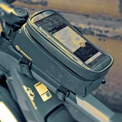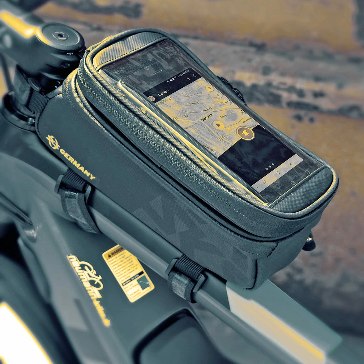 Duurzame materialen van rubberachtig, waterafstotend materiaal maken van de EXPLORER SMART-fietstas een must-have voor elke mountainbiker. Bijzonder praktisch is het bovenste mobiele telefoonvak met geïntegreerde kabeldoorvoer voor koptelefoons. De smartphone kan comfortabel worden bediend door de transparante beschermfolie. Het extra vak onderin is perfect voor het opbergen van een platte powerbank, waarmee de smartphone tijdens het rijden kan worden opgeladen. Dankzij de onderzijde met klittenband kan het hoesje voor de mobiele telefoon gemakkelijk worden verwijderd. Stevige, met rubber beklede klittenbandsluitingen bevestigen de tas aan de bovenbuis voor gemakkelijke toegang. De uitrusting omvat ook gelamineerde, waterdichte ritssluitingen met ergonomische EASYZIP, duidelijk geordende binnenvakken of oranje voering voor het gemakkelijker vinden van gebruiksvoorwerpen.
