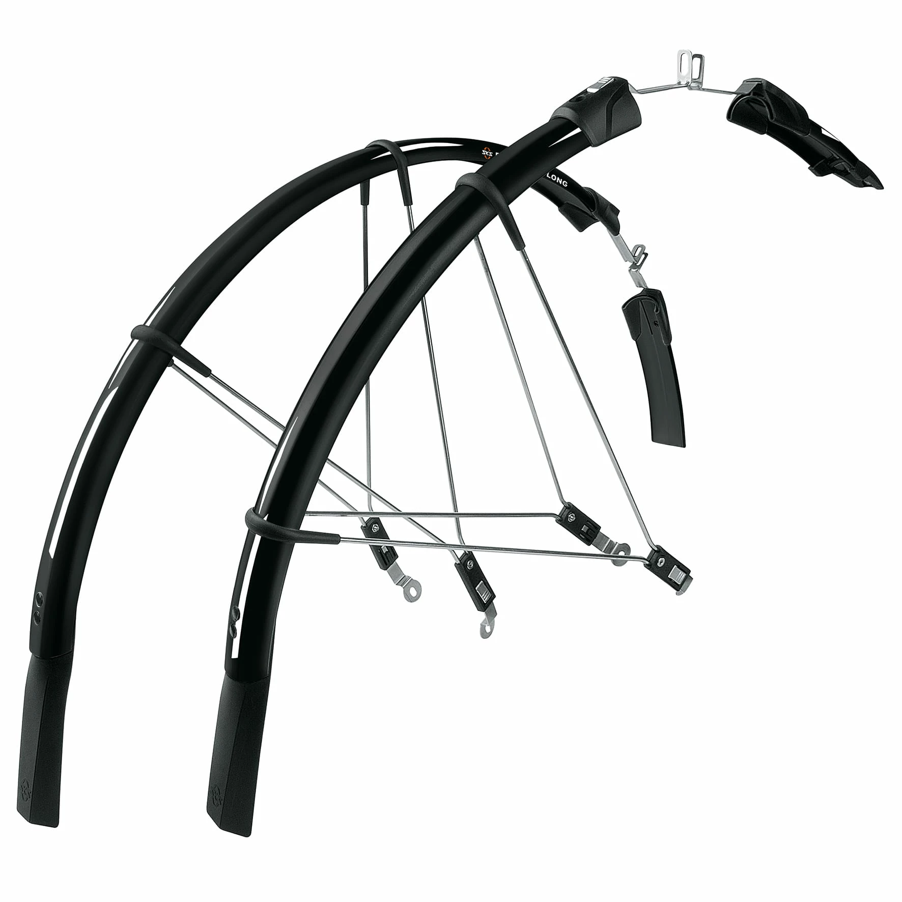 Deze ultralange clip-on wielbeschermerset voor racefietsbanden tot een breedte van max. 25 mm beschermt betrouwbaar, of je nu in een warme zomerregen rijdt of op eenzame wintertochten. De uiteinden van de wielbeschermers reiken tot onder de naafas. Dit biedt maximale bescherming voor u en de berijder achter u. De wielafschermingen kunnen perfect aan de radius van de banden worden aangepast door de lengte van de beugels aan te passen. Nadat de metalen beugels eenmaal op het wiel zijn gemonteerd, kunnen de wielbeschermers binnen enkele seconden worden gemonteerd en gedemonteerd.