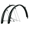 De Veloflexx wielset combineert de stabiliteit van een vast gemonteerd spatbord met de flexibiliteit van een insteekbaar wielset. Aangezien de Veloflexx een doorlopende wielbeschermer heeft, is hij alleen compatibel met schijfremmen. Met de Veloflexx-brug kan het achterspatbord zonder gereedschap aan de bovenkant van de staande achtervork worden bevestigd met behulp van rubberen riemen. Deze montageoplossing is niet langer afhankelijk van de dwarsbalk waaraan de remklauw van de velgrem gewoonlijk is bevestigd. Aan de voorkant wordt de Veloflexx met een rubberen klittenband of kabelbinder aan de drievoudige klem bevestigd. De frame-adapters maken het mogelijk hem op elke vork te monteren en zijn tevens in hoek verstelbaar. De zwart gecoate stangen zorgen voor nog meer grip.