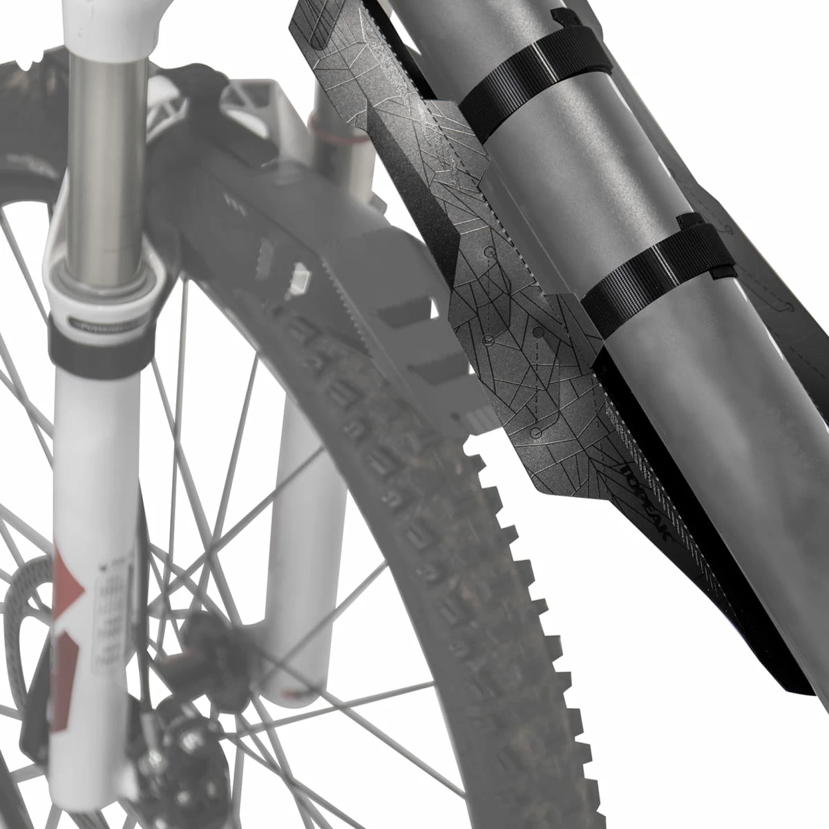 Modderbeschermer van Topeak in een modern ontwerp. Deze flap is stevig bevestigd aan de voorkant van de onderbuis met een klittenband band om te beschermen tegen vuil dat omhoog wordt geslingerd van het voorwiel.